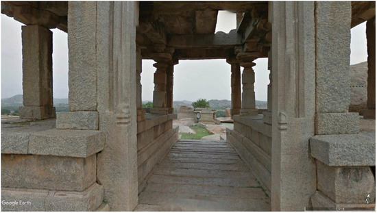 The Mula Virupaksha Temple and new node are located slightly north of the hill apex. This part of the hill is characterized by an expanse of exposed granite sheetrock on which the second Virupaksha temple was built to conform to the gentle contours of the sheetrock. This, along with a series of intentional design decisions by the temple artisans, worked together to naturalize the monument into the fabric of the sacred Hemakuta Hill space. These strategies include appropriating the small cistern by abutting the feature. The orientation of the temple (83° from north) created an intimate view of the water feature and the nearby Matanga Hill in the distance for devotees that entered the monument’s mandapa. Additionally, the orientation and the novel use of the non-longitudinal axis of the temple for the devotee to enter and exit its mandapa mimicked and directed the south–north flow of movement across the hill. In addition, the sightline of the devotee upon exiting the mandapa intentionally directed the gaze to the other Virupaksha Temple at the base of the hill and towards the north Pampa node. Figure 5 captures the line-of-sight northwards (353° from north) that a devotee saw entering and exiting the temple: visible is the large and later Sangama addition of a kanakagiri gopuram built over a theoretical northern Virupaksha ceremonial gateway leading to the north Pampa node, in addition to the Kampila-raya’s royal memorial temple. Thus, sensorial (visual) and physical (alignment) relationships with Pampa and between Pampa and the other Virupaksha temple was established.