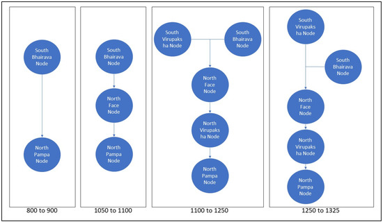 From the 12th through the early 14th century, the Bellary District of Hampi flourished, as did the Pampa tirtha, thanks to the patronage of local chiefs. Larger geopolitical changes on the subcontinent, such as the fall of the Later Chalukya Empire and the rise of its successor states, permitted the development of a distinct microregional identity in the Bellary District. This is reflected in the inscriptions of 1173 and 1181 providing new, specific names for the area, such as “Ballakunde-nadu” and “Doravadi-nadu” (Wagoner 1996, p. 163). During this period, a local group of Sinda chiefs established political control over the Hampi area and subsequently moved their royal cult of memorial temples to Pampa tirtha from Kurugodu. Their royal memorial temple, the Immadi Rachamallesvara Memorial Shrine, expanded the north Pampa node by situating what became a double shrine to abut the Pampa Temple on its north side. Likewise, the Kampilis, in the following period, did the same under Kampili-raya (Wagoner 1996, pp. 166–67) by situating two new memorial triple-shrine temples within the north face node on the Hemakuta Hill. Simultaneously, a more focused development, in terms of resources and skilled labor was directed to building and expanding two Virupaksha nodes, thus transforming the Pampa-based tirtha into a Virupaksha cult center. Prior to the 12th century, the network of nodes expanded along the axis that linked Bhairava to Pampa. The network graphs (Figure 10) clearly illustrate the spatial methodologies used by the builders of the Virupaksha cult to infuse their god into the fabric of the site and to supplant Bhairava in his configurational relationship with Pampa.