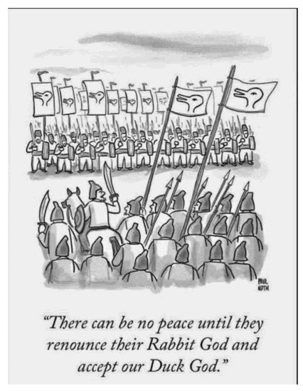 Paul Noth, “There can be no peace until they renounce their Rabbit God and accept our Duck God”. The New Yorker, 1 December 2014, p. 78.