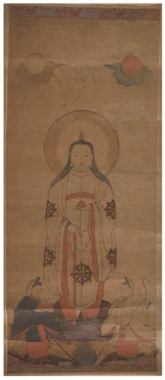 An elderly nun kneels on a ground of white pebbles and forms the “closed stupa mudra” (heitō-in) to invoke the large emanation of Kongōshōji’s Uhō Dōji that appears before her (Figure 1). A large pine and plum tree elegantly frame the figures. Above, the sun and moon rest on auspicious clouds while a wish-fulfilling jewel floats on a golden cloud between them.