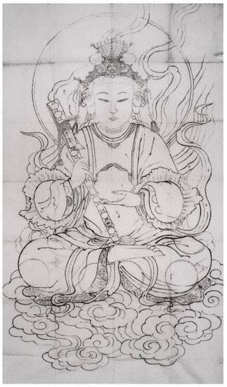 An aged nun wearing a luxurious gold brocaded kesa is depicted in profile kneeling on a ground of white pebble stones (Figure 1). She appears as if in a trance, looking towards a large emanation of Uhō Dōji 雨宝童子 (Rain Treasure Child), whom she invokes with the closed-stupa mudra (heitō-in 閉塔印). Uhō Dōji manifests in the form enshrined at Kongōshōji temple 金剛證寺, as a child with long black hair, balancing a five-wheeled stupa (gorintō 五輪塔) on its head, and holding a wish-fulfilling jewel (nyoi hōju 如意宝珠) in its left hand and a jeweled staff (hōbō) in its right. A white jewel sparkles on the deity’s forehead, a dharma wheel (rinpō 輪宝) rests on its hairline. The deity wears shoes and a white robe patterned with red and gold dharma wheels. A large pine and plum tree frame the two figures. The sun and moon rest on auspicious clouds above; a wish-fulfilling jewel perched on a pillow of golden clouds floats between them.