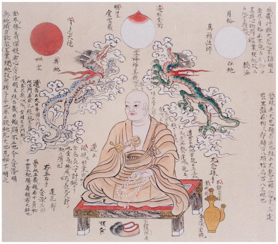 Kūkai with Jewels and Dragons, 14th century, color on paper. Ninnaji, Kyoto. Reproduced with permission from (). Copyright 2016 University of Hawai‘i Press.