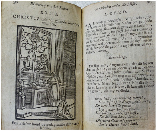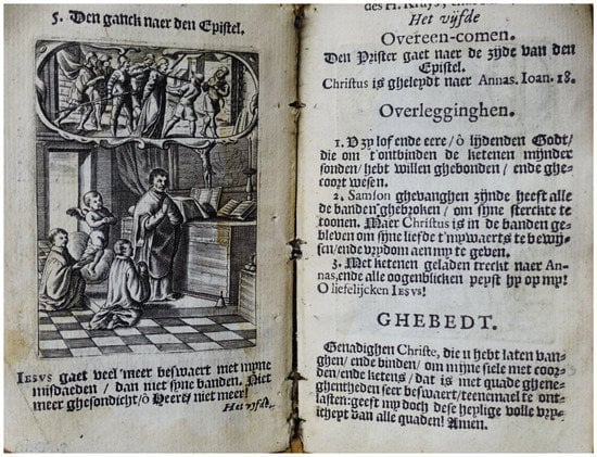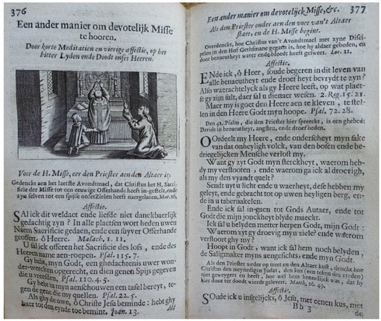 In his Regel der Volmaecktheyt from 1650, the Dominican Father Johannes de Lixbona, (c. 1600–1670), suggested that the devout might go to the church to meditate on the presence of God or on the Passion of Christ. If possible, one should even attend mass spiritually twice a day, to meditate on the Passion following the ordo, and to read the hours and the rosary.75 Such praxis pietatis was well served by the mass books or mass-related texts in the devotional books, covering the double setting that characterized devotional life, just as it had been characterized since the Late Middle Ages, where devotional practices took place in public spaces, often in churches, thereby gaining a collective, quasi-liturgical, character as shown by Eamon Duffy (2006, pp. 53–64).76 Acts of piety, including mass attendance, were increasingly performed communaly (Châtellier 1991, p. 149). In 1674, the Jesuit Father Andrien Parvilliers, (1619–1678), assumed that those practicing the “Way of the Cross” did so in “churches chapels, oratories, or other such places”(Parvilliers [1674] 1729, p. 12). It was private prayer, yet often including the entire household. Ideally, at least, the house became an oratory (de Viguerie 1996, p. 101). A late eighteenth century prayerbook, Godvruchtig gebede-boeksken (Anonymous 1790), admonished the faithful: