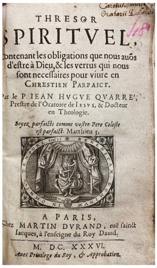- Quarré, Jean-Hugues. 1636. Thresor Spiritvel, Contenant les Obligations que nous Auós d’estre à Dieu, & les Vertus qui Nous Sont Necessaires pour Vivre en Chrestien Parfaict. Paris: Martin Durand. [Google Scholar]