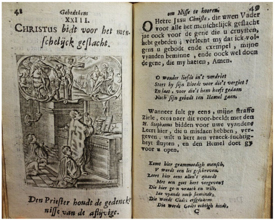 The complex phenomenon of such books was not accessed through reading alone, but through the convergence of received instruction, socialized knowledge, images, texts, and liturgy into one devotional experience, the “choses exterieures & sensibles” indistinguishable from their imprint “dans l’esprit des plus pauvres & des plus ignorans” (Olier [1657] 1661, pp. 15–16). As devotional instruments, they were useful in various settings, including educational ones. A wide range of purposes was mentioned by Andries promoting his book Het ghedurigh cruys ofte Passie Jesu Christi, published in 1649, “O, lover of the continuously-crucified Saviour, here you have a nice opportunity to promote his honour and love, not just in the household, but also in the churches, inns, and monasteries, in ships, schools for the poor; in villages: for the lord pastors, those who receive religious instruction, etc.”.97 Even if the mass books meant for mass, they were also devotional books to be used outside the mass, and in addition they were also expedient educational tools during catechesis and missions, not least when illustrated. This additional use, mentioned explicitly in 1649, was repeated almost a hundred years later in the introduction to the reader in Het Kleyn Paradys (Anonymous 1743):