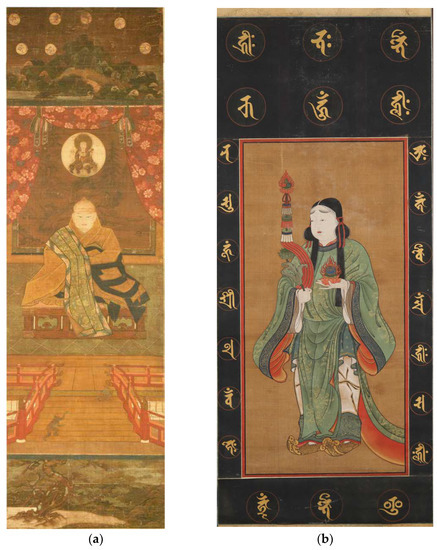 (a) Hie Sannō Jūzenji mandala, Kamakura period (1185–1333), hanging scroll, color on silk. Shinnyo-en temple, Tachikawa, Tokyo; Reproduced with permission from (Faure 2016b). Copyright 2016 University of Hawai’i Press. (b) Jūzenji bījā (seed-syllable) mandala, Muromachi period (1336–1573), hanging scroll, color on silk. Kannon-ji temple, held at Biwako Bunkakan, Shiga prefecture.
