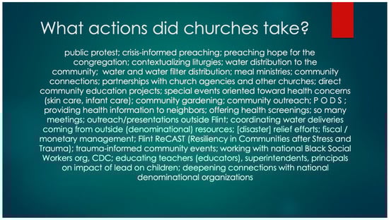 Our first session together had a staggered beginning with folks having to juggle prior commitments and extract themselves from their usual obligations. Once we were all together, though, there was a sense of anticipation and hopefulness around what might come of this communal endeavor. From the initial two project phases, Daley Mosier and Wymer had come up with an extensive list of particular actions faith leaders had taken during the water crisis. We then vetted that list with our co-authors, here (Figure 1). One of the most notable additions was the great number of meetings that took place, with representatives from a wide variety of government, city, nonprofit, faith-based, and educational organizations. The dynamics of those meetings had made an impression as folks recounted how much time and effort they required. This speaks to a kind of persistence that refuses to leave the conversation until solutions are worked out for the benefit of everyone.
