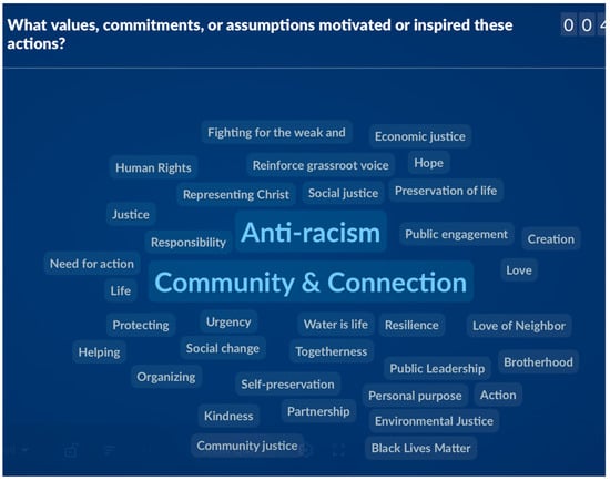 Following our discussion on actions, we used an online tool where folks could use a QR code to add text to a word cloud, we compiled a list of “values, commitments, or assumptions” that motivated or inspired the actions. The list included the phrases: “fighting for the weak”, “economic justice”, “human rights”, “reinforce grassroot voice”, “hope”, “representing Christ”, “Social justice”, “preservation of life”, “Justice”, “Responsibility”, “public engagement”, “creation”, “Love”, “Life”, “need for action”, “protecting”, “water is life”, “resilience”, “togetherness”, “love of neighbor”, “Organizing”, “Self-preservation”, “Public leadership”, “Action”, “Environmental justice”, “Community justice”, “kindness”, “Black Lives Matter”; with “Anti-racism” and “community and connection” taking up space in the center in enlarged font. We then took a moment to pause and reflect on the words and phrases. Using a visual tool in this way allowed us to see the three most salient values clearly: anti-racism, community and connection, and justice (with justice encompassing a number of related values) (Figure 2).
