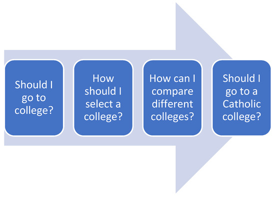 In order to provide a framework for the analysis, it is useful to place ourselves within the frame of mind of a student (or a student advisor). As shown in Figure 1, four basic sequential questions are likely to be considered by students: (1) Should I go to college? (2) How should I select a college? (3) How can I compare different colleges? (4) Should I go to a Catholic college? While answers to those questions can be provided only by individual students themselves, some data are available to inform responses to these questions.
