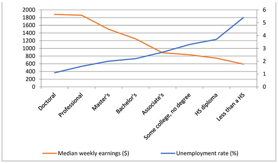 Unemployment Rate (%) and Median Weekly Earnings (USD) by Educational Attainment. Source: U.S. Bureau of Labor Statistics. Note: Data updated in September 2020.