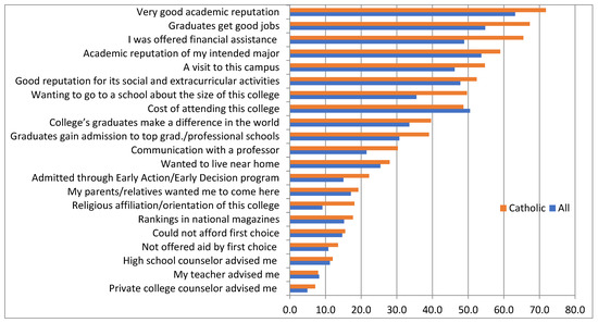 Share of College Freshmen Declaring Various Reasons as “Very Important” in Deciding to Go to that Particular College [Ranked by Share for Catholic Institutions], 2019 CIRP Freshman Survey (%).