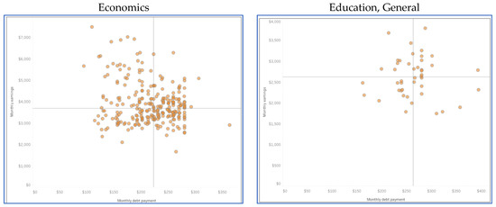 The scatterplot for economics has more data points than that for education simply because more schools operate undergraduate programs in economics with a sufficient number of graduates for statistical validity in the estimates than is the case for education as an undergraduate major. The average expected monthly earnings for economics majors are typically higher than for education majors as expected. The differences in debt payments tend to be smaller, although, on average, education majors have slightly larger debt payments than economics majors.