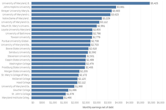 As an illustration, the visual for expected monthly earnings net of debt payments and estimates for holders of Bachelor’s degrees in Maryland are provided in Figure 5. The choice of Maryland is purely illustrative and based on the fact that the data can be displayed easily because the number of colleges and universities in the state is not too large.