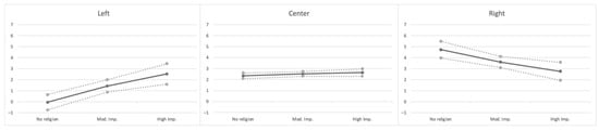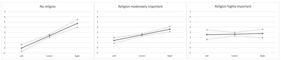 Predicted anger towards Muslims (estimate and confidence interval from Model 2) according to religiosity and political viewpoint: no religion to high importance. Note: predictions are for the latent underlying anger variable, and therefore allow for predictions outside the bounds of 1 to 7.