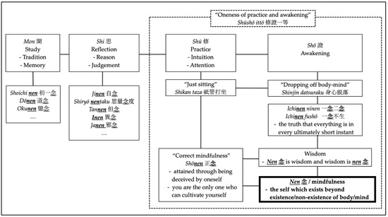 Also, it is known that philosophers outside the school, including Izutsu Toshihiko (井筒 俊彦 1914–1993) and Yuasa Yasuo (湯浅 康雄 1925–2005) in fact paid special attention to this state (Ibid., pp. 91326, 14227). There should still be much room for integrating this etymology of Zen philosophy into today’s mindfulness in order to give “further width and depth” to it; for, just as Izutsu directly argues when addressing Dōgen’s philosophy, “zazen is the only or otherwise the best potential to reach the unification of body-mind” (Izutsu 2014, p. 4228), which should be the very state of awakening (shō 證), or nen 念, in Dōgen’s philosophy.
