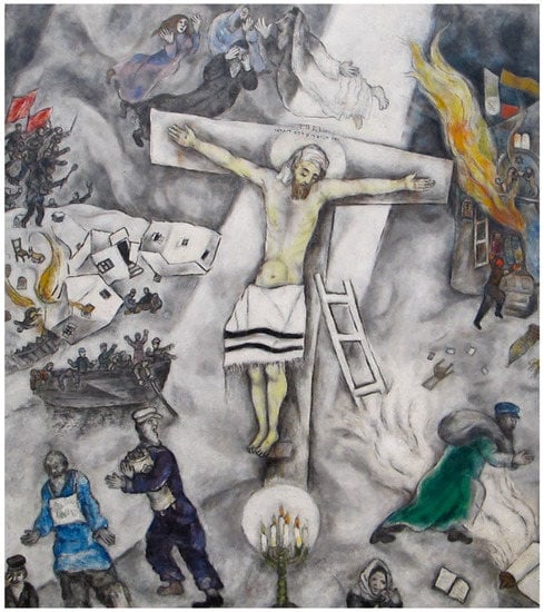 Marc Chagall, White Crucifixion, 1938. The Art Institute of Chicago. © 2018 Artists Rights Society (ARS), New York/ADAGP, Paris, also made available under Creative Commons Zero (CC0). Image courtesy Ed Bierman, licensed under CC BY 2.0. To view a copy of this license, visit https://creativecommons.org/licenses/by/2.0/?ref=openverse (accessed on 5 August 2022).
