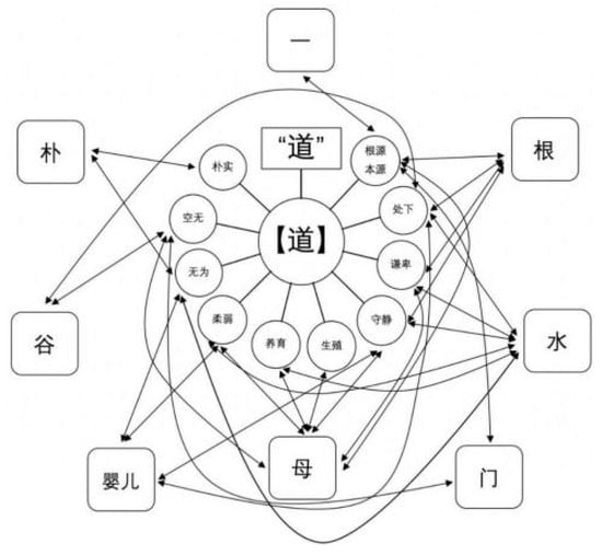 As shown in Figure 1 and Table 1, [Dào] is the core concept surrounded by the Xiàng concepts like Pǔ, Yī, Gēn, Shuǐ, Mén, Mǔ, Yīng’ér, Gǔ and so on5. In the Dào Dé Jīng, Laozi uses concepts like Mǔ to illustrate his idea of Dào, and concepts like Mǔ serve as the Xiàng (source domain) in building the structure and content of Dào (target domain). What lie between [Dào] and Xiàng are the semantic features shared by them. In the figure, the two-way arrows are used to reflect the mutual relations between the two ends6. For example, the two-way arrows are used to reflect that Xiàng shares the semantic features and these concepts share intertextuality. As shown in the figure, the author holds that the interrelated mappings from Xiàng and the semantic features to [Dào] form the semantic field of [Dào], serving as the structure and content of [Dào], and bringing people closer to the concept of [Dào].