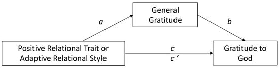 Conceptual Mediation Model. Note. “a” and “b” are direct effects. “c” is the total effect of a predictor on gratitude to God, and “c’” is the effect of the predictor on gratitude to God after accounting for general gratitude. In the positive event model, gratitude in response to the positive event was the mediator, and GTG in response to the positive event was the outcome. In the trait model, trait gratitude was the mediator, and trait GTG in was the outcome.