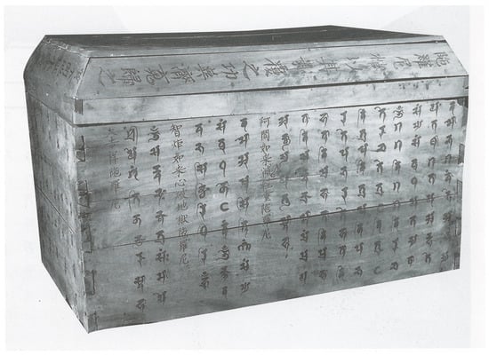 Wooden coffin inscribed with Buddhist incantations. Liao dynasty, dated 1093. H. 59.8 cm. Excavated from Zhang Wenzao’s Tomb in Xiabali, Xuanhua, Hebei Province of China. After ().