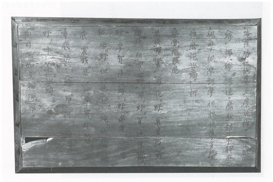 Composed of a lid in truncated pyramidal shape and rectangular body, the Xuanhua coffins differ markedly from those favored since the Northern and Southern Dynasties. Since the latter consist of a vaulted lid and rectangular body, they are classified as a “type with round top and rectangular bottom” (shangyuan xiafang xing 上圓下方形) in modern scholarship. In contrast, these Liao wooden coffins are rather similar to Buddhist reliquaries consisting of a lid in truncated pyramidal shape and square body—the most basic form of Chinese reliquaries that trace back to the Northern Wei 北魏 (386–534). Three of the lid’s four sloping sides bear an inscription in Chinese, while the remaining side bears five Siddhaṃ letters. The Chinese inscription reads: “The dhāraṇī coffins are efficacious in protecting what comes under their shadow. It is hoped that they will transcend the substance of the returning hun soul, exempt it from hell, and further award it with an eternal heavenly body. We trust that the good causes of dust [on the dhāraṇī coffins] and ink [used to inscribe incantations] are as indestructible as [the universe, which is sustained by] the energy of qian and kun. Reverently inscribed” (陀羅尼棺, 以其影覆之功, 冀濟魂歸之質, 不聞地獄, 永受天身. 諒塵墨之良因, 與乾坤而等固. 謹記) (Figure 7).20