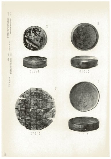 Metal cases and the Mahāpratisarā Dhāraṇī print introduced in vol. 9, entitled “Craftworks Discovered inside Tombs of the Koryŏ Period,” of the Album of Korean Antiquities (Chōsen koseki zufu 朝鮮古蹟圖譜). After ().