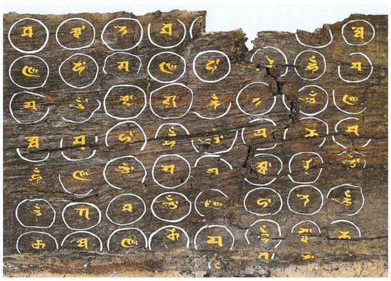 The wooden inner coffin bears Sanskrit inscriptions of the Mantra of the Six-syllable King of Great Clarities (Oṃ maṇi pad me hūṃ) and Mantra for Shattering Hell (Oṃ karadeya svāhā) all over its lacquered surface. Circles with a diameter of 8–10 cm were drawn on the surface in greyish white pigment containing silver. A Siddhaṃ letter was written inside each circle in yellow pigment containing gold (Figure 14). Currently, some 350 letters are discernible. Considering the size of the wooden plates, the rectangular coffin likely was covered with 738 Siddhaṃ letters in total on all of its sides except for the bottom (Figure 15) (). In addition to Siddhaṃ script, Lantsha script was sometimes used, and some of the letters forming the incantations were omitted in the inscriptions. In accordance with the writing style of Chinese characters at the time, the Sanskrit letters were inscribed from top to bottom and right to left. The question then arises as to the origin of this particular combination of incantations.
