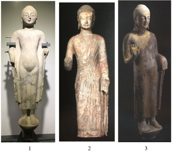 The main types of Qingzhou-style carved-in-the-round standing Buddha statues. (1): Buddha with diaphanous robe draped over both shoulders (type A), mid-6th century, excavated from Zhucheng, Shandong Province, Zhucheng Museum (source: photograph by the author). (2): Buddha with densely pleated robe covering only the left shoulder (type B), mid-6th century, excavated from the Longxing Temple site, Qingzhou, Shandong Province (source: Fan 2016, p. 95). (3): Buddha with diaphanous robe covering only the left shoulder (type C), mid-6th century, excavated from the Longxing Temple site (source: The National Museum of Chinese History 1999, p. 110).
