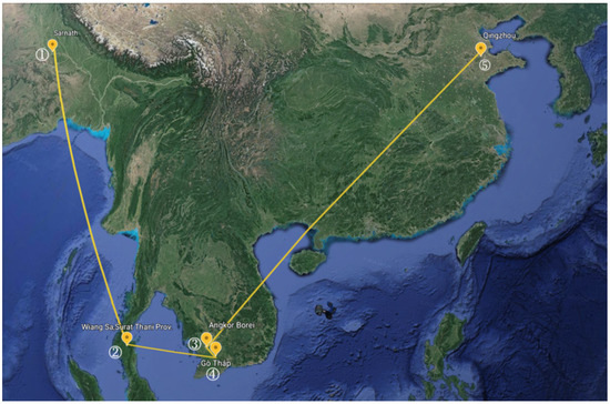 The schematic diagram of transmission route of standing Buddha statues with diaphanous robe draped over both shoulders (type A). ① Sarnath, Northeast India; ② Wiang Sa, Surat Thani, Thailand, North-Central Malay Peninsula; ③ Angkor Borei, Ta Keo, Cambodia, Lower Mekong; ④ Mekong Delta; ⑤ Longxing Temple Site, Qingzhou, Shandong Peninsula, China. Note: The lines in the picture are connected according to archaeological excavation or collected finds and indicate the approximate transmission route, not the exact one. The same goes for the maps below.