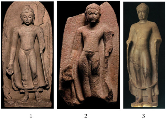 Carved-in-the-round standing Buddha statues of Qingzhou can be found in both a local style and a foreign style, and the distinguishing difference between the two is that the latter type wears a thin, tight-fitting robe. Based on the currently published materials, there are three main types of statue of the foreign style, which account for at least half of the total finds. These are as follows: type A—standing Buddha with a diaphanous robe draped over both shoulders; type B—standing Buddha with a densely pleated robe covering only the left shoulder; and type C—standing Buddha with a diaphanous robe covering only the left shoulder (Figure 1). Of these, the type A statue (Figure 1 (1)) is the most common and has the widest distribution. Up until now, none of the standing Buddha statues of the Qingzhou style have been found with inscriptions suitable for accurate dating. Nevertheless, typological studies reveal that type A statues belong to an earlier period than the other two and can be dated to as early as the middle of the 6th century (Meng 2021, pp. 106–9). According to previous research, the foreign style Qingzhou Buddha statues originated in India, but their appearance was likely to have come under the direct influence of the similar local statues in Southeast Asia (Meng 2021, pp. 181–219).