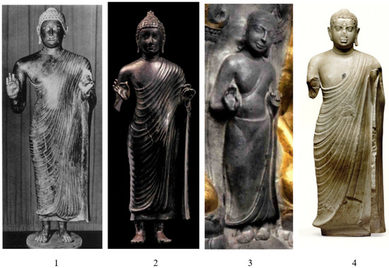 Standing Buddha statues with densely pleated robes covering only the left shoulder (type B). (1): Bronze Buddha, the 6th century, Dong Duong, Quang Nam Province, Vietnam (source: Griswold 1966, figure 6a); (2): Bronze Buddha, the 6th to 7th century, Nakhon Ratchasima, Thailand (source: Guy 2014, p. 35, CAT. 5); (3): The image of disciples on the relic box, the 6th century, relic chamber of Khin Ba stupa, Sri Ksetra, Myanmar (source: Guy 2014, p. 81, CAT. 27); (4): Buddha, Amaravati, the 2nd to 3rd century (Source: China Cultural Relics Exchange Center 2007, p. 59, figure 8).