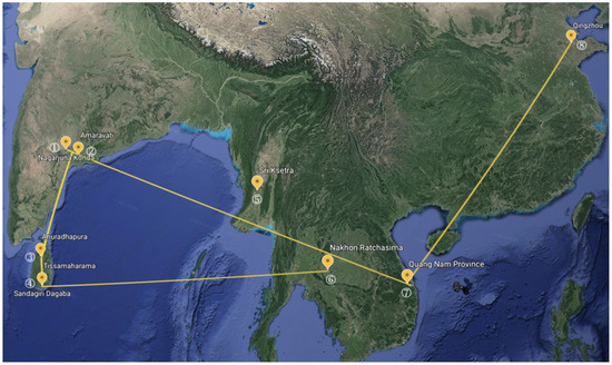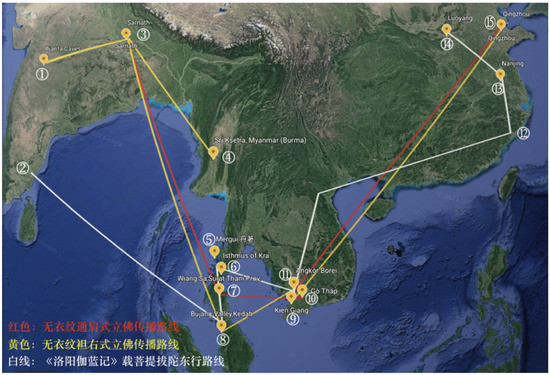 It is necessary to explain that before the middle of the 6th century, sea-to-land transportation and the status of the Malay peninsula as a traffic artery were caused by the limitations of shipbuilding and marine technology. Such transportation modes and the resulting key positions of this region are generally believed to have been roughly formed in the Han Dynasty when the ships were small and simple in structure and seamanship was not advanced enough to sail across the ocean, only allowing voyages along or close to the shore (Chen 1992, pp. 98–99, 102–4). The journey from Fu-nan to Tianzhu (天竺) during the Three Kingdoms (Wu State) period still passed this way (Yao 2020, p. 883). The north-central Malay Peninsula is relatively narrow, which leads to a relatively short transportation distance. Therefore, it was the safest and most efficient route for ships from South Asia to go ashore on the west coast of the Malay Peninsula, travel by land to the east coast and then enter the sea at the Gulf of Siam, and vice versa. The north-central Malay Peninsula thus became a key point for east–west traffic, and thus, the eastward coastal transmission route of Buddhist art in the 6th century may have passed through this region.