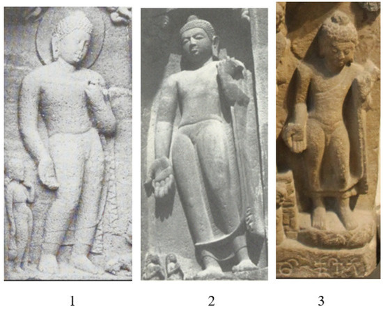 Standing Buddhas with diaphanous robe covering only the left shoulder (type C) in India. (1): Buddha of the Façade to left of door, Cave 19. Ajanta, north-central Maharashtra state, India, late 5th century (source: Huntington 1985, figure 12.4); (2): Buddha of the Façade, Cave 19. Ajanta, north-central Maharashtra state, India, late 5th century (source: Yagi 2013, p. 147, figure 15); (3): Buddha of a Stele, Sarnath, Eastern Uttar Pradesh state, Calcutta Museum, India, 5th century (source: https://commons.wikimedia.org/wiki/Category:Scene_from_Buddha%27s_Life_-_Indian_Museum_-_ACCN_S.4/A25096 (last access: 22 November 2022)).