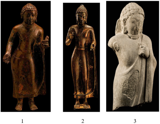 A standing Buddha statue with a diaphanous robe covering only the left shoulder was unearthed in Tháp Mười in the Mekong Delta and dated to the end of the 5th century (Figure 8 (3)) (Malleret 1963, pp. 156–57, PL. XXI). Despite the fact that Mekong Delta is located farther east, this find is dated earlier than the statues of the same style excavated in the Malay Peninsula. Its high ushnisha also shows the Southeast Asian ushnisha style seen on the standing statues with a robe covering only the left shoulder, prior to the influence of Amaravati and other styles. The bodies of 5th-century Indian standing Buddha statues with diaphanous robes covering only the left shoulder are bulky and not so slender (Figure 6). Some Southeast Asian statues of the 6th and 7th centuries show similar robust features (see Figure 4 (1) and Figure 7 (1)), while others are slim and slender (see Figure 3 (3) and Figure 7 (2)). The wooden Tháp Mười Buddha, as an early example of the latter, could shed light on the origin of this type of statue. Other examples are the 6th century standing Buddhas with diaphanous robes covering only the left shoulder, unearthed in the Malay Peninsula and the Mekong Delta. Regarding the two layers of robe-tails on the left calf, the shorter outer one is generally arc-shaped. This is very different from the Sarnath statues, on which this part is a right angle (Guy 2014, p. 75), but bears significantly more resemblance to the Ajanta cave statues, despite their more distant location (See Figure 6). As discussed above, the transmission of Buddhist art was not a linear process from west to east, but occurred in multiple different instances. During the repeated transmission from the 5th to the 7th century, the three types of standing Buddha statues were gradually locally adapted in Southeast Asia and at the same time continued to spread farther east, eventually reaching China.