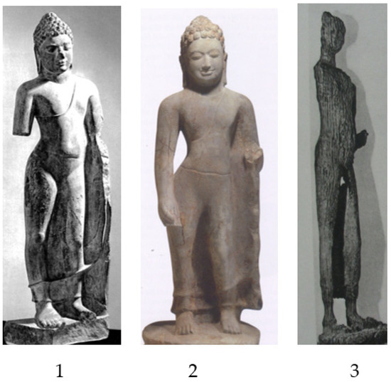 Standing Buddhas with diaphanous robe covering only the left shoulder (Type C) in the Mekong Delta. (1): Buddha, stone, excavated at the site of Vat Romlok, Angkor Borei, Cambodia, 6th century (source: Giteau 1965, p. 43, Pl. 8); (2): Buddha, stone, excavated at Nen Chua, Kien Giang Province, Vietnam, 7th century (source: Döng 2022, p. 338, figure 214); (3): Buddha, wood, excavated at Tháp Mười, Southern Vietnam, late 5th century (source: Malleret 1963, Pl. XXI).