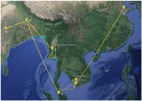 As discussed above, the north-central part of the Malay Peninsula, the lower reaches of the Mekong River and the Mekong Delta region are important transit points for the transmission of foreign statue styles to Qingzhou. In previous studies, scholars have focused on the latter, that is, the transfer role of Fu-nan, while the exchanges of Buddhism and Buddhist art between the north-central Malay Peninsula and the Northern Dynasties has been less or unsubstantially studied. The excavation sites of the two types of standing Buddhas with diaphanous robes in the Malay Peninsula (Figure 10) are concentrated in the area between Kedah and the Isthmus of Kra, which roughly coincides with the location of Kou-chih and Tun-sun, the ancient kingdoms Bodhibhadra passed through on his journey to China (Figure 11). Therefore, in the 6th century, the north-central Malay Peninsula was an important transit point on the eastward sea-borne route that spread Buddhist art to China. Judging from the finds so far discovered, the style of wearing diaphanous robes draped over both shoulders that originated from India was first introduced to Southeast Asia though the north-central Malay Peninsula (Figure 3).