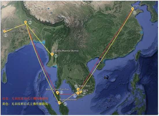 The above records describe Bodhibhadra’s eastbound route in detail: starting in the Indian subcontinent and then passing through three important transit areas in Southeast Asia. The first is Guozhi, which is on the west coast of the north-central part of the Malay Peninsula (Kedah or slightly north of the Isthmus of Kra); the second is Tun-sun, the northern part of the Malay Peninsula (from Mergui to the north of the Isthmus of Kra); and the third is Fu-nan, which mainly refers to the lower reaches of the Mekong River and the Mekong Delta region. After this, the route passed north to northern Vietnam, then through the coast of Fujian and Zhejiang and finally entered the region of the Northern Dynasties. This route was roughly the same as the transmission paths of the type A and C standing Buddha statues from Southeast Asia to the Northern Dynasties (Figure 11).