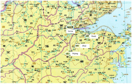 19. Tan, Qixiang 譚其驤. 1982. Zhongguo lishi ditu ji 中國曆史地圖集, Book 6 (2), Liangzhe Circuit, “Guoxue daohang 國學導航”. Available online: http://www.guoxue123.com/other/map/pic/13/07.jpg (accessed on 3 August 2023).