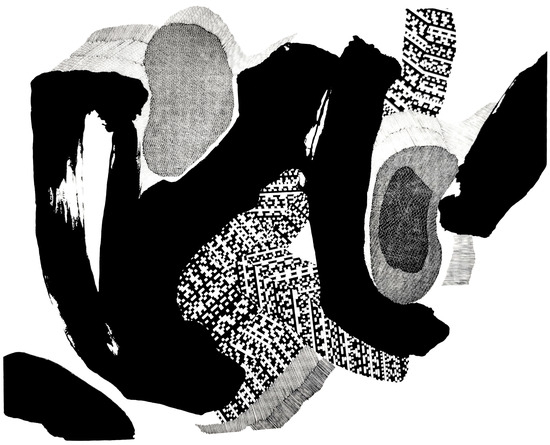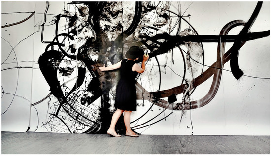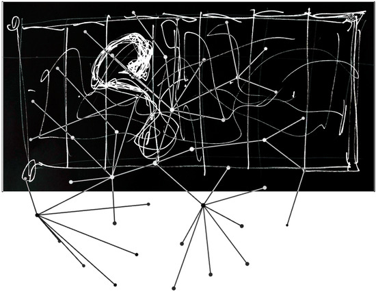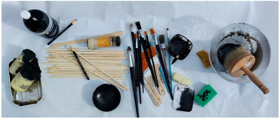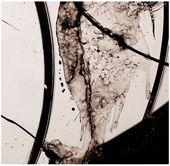 The movements of the body when drawing with a broad, coarse brush are impulsive and rendered with strong strokes; they alternate with sections rendered with specially crafted “tools”. Brushes and ready-made purchased sketching instruments are often insufficient for carrying out the intended intervention. For example, the brush lacks the resistance to leave traces on the surface that can only be formed by strong pressure. The artist then uses his own inventions and interventions to create the tool (Figure 5). The addition of different brush extensions, which increase the distance between the paper and the body of the artist performing the stroke, enables the artist to achieve different stroke qualities. In addition to modifying the tools, the material, in this case, ink, is also modified. In the work Story from the Beginning, the washed ink technique is explored. Instead of water, mineral-carbonated water was used, which allowed for new expressive possibilities. Not only was transparency achieved, but a specific texture (Figure 6) was also achieved, which cannot be achieved by mixing ink with non-carbonated water.
