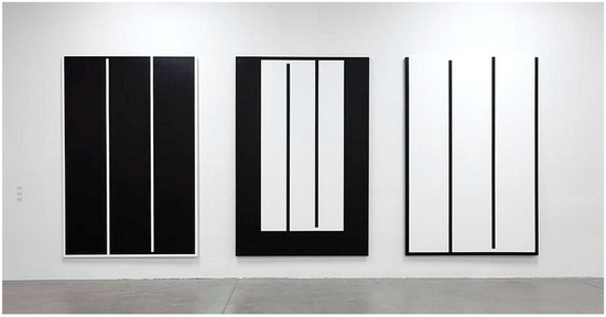 Julije Knifer (Osijek, 23 April 1924–Paris, 7 December 2004), a Croatian painter with a propensity for conciseness and minimalism, developed a black-and-white image and form in the 1960s of the 20th century that he would not abandon until the end of his creative life. His reflections on the philosophy of existence and absurdity, along with the serial music, found in meanders a repetitive, monotonous rhythm as “the simplest way to express his greatest complexity” (Horvat-Pintarić 1970). The recurring motif of the meander (Figure 2) tends to be not only a transfer of the author’s visual repertoire but also an imprint of the author’s spiritual state, his reflections, and his artistic behavior. The picture shows a part of the exhibition Julije Knifer: Without Compromise, held in 2014 at the Museum of Contemporary Art in Zagreb. Visible is the rhythm of the works, which “undress” the black and reveal the white through their internal logic.