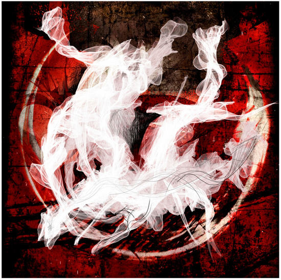 In the digital drawing Blessed are Those Who Endure in Peace (Figure 8), the offered reality has been reshaped and aestheticized; it operates according to its own laws. In its poverty and its fragmentation, it speaks of being, evoking the face of life and death, deeply human, with an ineradicably rooted hope in the living man and his extension beyond this time and this space—a man with immortal life.