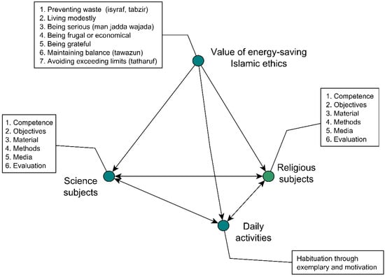 Habituation, as a pillar of moral education to instill virtues (Attaran 2015), aligns with protecting the environment and conserving energy, a principle rooted theologically in the Qur’an and the guidance of the Prophet Muhammad (Khalid 2022). Research by Iwasa (2017), Lisnawati (2016), and Suyatno et al. (2019, 2020) indicate that habituation is a common strategy for internalizing ethical values in both school and daily life. Islam sets ethical standards to avoid harming the environment, stressing that humans will feel the effects themselves in surah Ar-Rum [30]: 41 and advocating for a non-wasteful lifestyle, contextualized within the wise use of energy in surah Al-Isra’ [17]: 26–27 (Al-Damishqī 2000; Shihab 2011).