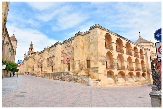 One of these mosques is near the contemporary Puerta de Gallegos, formerly inside the city walls. The mosque was built next to the Bāb ‘Āmir, one of the gates that gave access to the madīnat from the west, and to the wall surrounding it. The construction of its minaret involved the invasion, albeit minimal, of the coastal path of this wall. Also, within the madīnat there was the mosque whose minaret survives today in the San Juan church. This mosque presided an open area or square and was located on a very important street that crossed the walled city and connected the aforementioned Bāb ‘Āmir with another city gate, the Bāb al-Hadīd sited in the Eastern wall (González Gutiérrez 2018, p. 10).