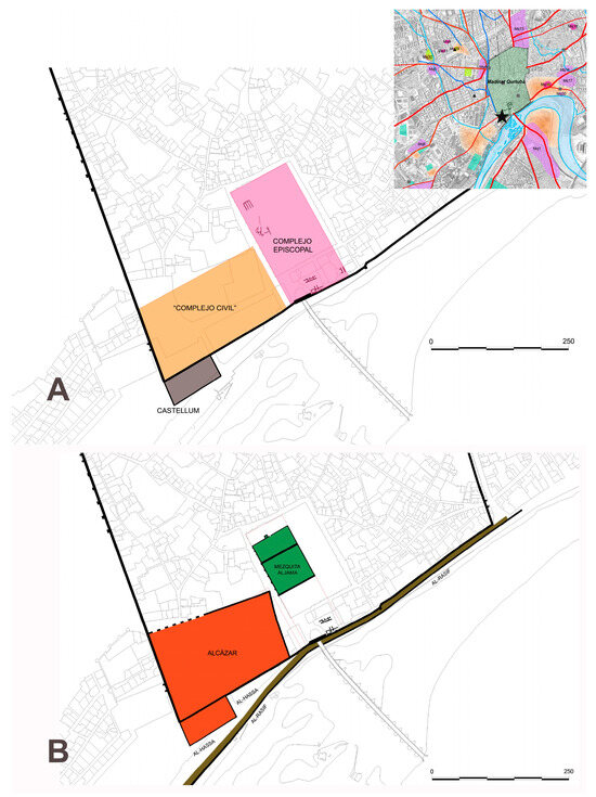 Topographical relationship between the Alcázar and the mosque, located in the south western corner of the madīnat (see the black star on the general map provided up-right). (A): location of the late-antique civil palace and episcopal complexes. (B): location of the emiral Alcázar and mosque (in León and Murillo 2009, 405 fig. 2 and 420 fig. 6, reproduced with permission).