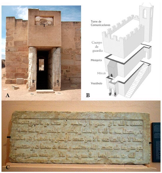 Together with the previous examples, there are other cases that reinforce the hypothesis of mosques serving not only as a worship place for the Muslim community, but as scenario or public display for the Umayyad dynasty and its achievements on this side of the Mediterranean. One of them is located in Mérida. Here, by the bank of the Guadiana River, a fortress-alcazaba-was erected in emiral times (see Figure 4). According to its foundational inscription (see Figure 4C), this was a fortified enclosure commanded by the emir ‘Abd al-Raḥmān II, conceived as a key piece to implement the emiral power in the city (Feijoo and Alba 2005, p. 566):