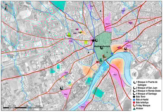 Map of the emiral Qurtuba with indication of the main urban elements mentioned in Section 4 (basis map Convenio GMU-UCO, reproduced with permission and modified by author).