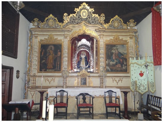 Marcos Torres, the patron of the statue that concerns us, was born in Icod de los Vinos in November of 1697 and received an exemplary education. He was a soldier, mayor, lieutenant general of the royal armies, governor of Tenerife, moneylender, and independent ship captain. He was, above all, a cultured man10, an incipient collector interested in furnishing and decorating his house with items brought from the Indies, like most of his countrymen. In 1734 he married a woman of noble origins, Doña Magdalena Méndez Fernández de Lugo y Gallegos, and, urged by his desire to obtain an estate in Tenerife11, he became a credit agent, bought some ships, and dedicated himself to the transatlantic trade, mainly between Havana (Cuba), San Francisco de Campeche (Mexico), La Guaira (Venezuela), and Santiago de los Caballeros (Guatemala)12. Years later, a widower, he married Doña Clara Magdalena de Chirino, a noblewoman and the daughter of marquises. Thanks to his marriages and the wealth obtained in colonial trade, Torres positioned himself among the leaders of the island. He accumulated a fortune that exceeded thirty thousand pesos and was one of the large landowners in the locality of Icod (Gómez Luis-Ravelo 2022). His most prolific years were between 1736, when he traveled to Campeche for the first time, and 1746, the year in which he returned with a Mexican carving of Our Lady of Sorrows and the crocodile that has accompanied her ever since. On this last trip he also brought the necessary objects and elements for his future shrine, which would come to fruition around 1784, once the estate had been obtained in 1765 and dedicated to the devotion of the Virgin13 (Figure 2). He died in 1780 in Icod and was held in wake in his own chapel.