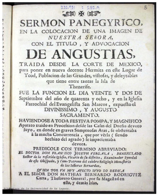 The materiality of the sculpture is not always enough on its own to explain everything and create or increase a devotion to the image. Materiality can reveal information about the new invocation, establish relationships with workshops exposing the type of craft and materials employed, and accentuate it with its mere presence, but sometimes it is appropriate to explain further through texts and testimonies so that the image’s thaumaturgical power does not go unnoticed or become confused with her own materiality. There is a hierofanic text linked to Our Lady of Sorrows, the “Panergyric Sermon in the enthronement of the image of Our Lady, with the title and invocation of Angustias, brought from the court of Mexico, to put in a new respectable Shrine in this Place of Icod, a large, attractive, and pleasing Population that has, between so many, the Island of Thenerife”30, as it says on its cover (Figure 4). The sermon, the only one printed tied to Our Lady of Sorrows and her ventures, was given on 22 September 1748 by Fray Francisco Joseph de Vergara, and published in Cadiz with the relevant licences and approvals in 1751. It was dedicated to Matías Bernardo Rodríguez Carta, the royal treasurer, a detail that could have been contributing to the fact that it was printed in the Andalusian port city.