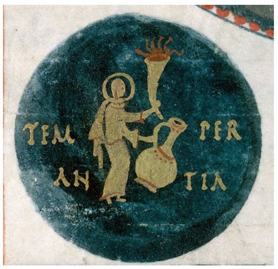 “Chaste Temperance 1” appeared in the 9th century and was codified from classical sources and Aurelius Prudentius’s work. The main attributes of this iconographic type are the torch and the pitcher or container, which refer to how Chastity defeats Lust. In Cambrai Gospels (9th century, Cambrai, Municipal Library, ms. 327, fol. 16v) and Marmoutier or Autun Sacramentary (ca. 845–850, Autun, Municipal Library, S 019, fol. 173v) (Figure 1), Temperance holds a torch and pours water with a pitcher. These attributes remind us of patristic sources. Julianus Pomerius explains that the main activity of Temperance is extinguishing the passion’s fire: “Ignem libidinosae voluptatis extinguit” (Pomer. De vita contemplativa, 3, 19; PL LIX, 502). So, these attributes refer to extinguishing concupiscence fire, as in Antiquity was Venus and Cupid’s enemy.