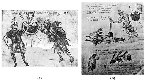 (a) Chastity vs. Lust, Psychomachia, ca. 900–1049, Brussels, Bibliothèque Royale de Belgique, ms. 10066-77, fol. 116r. (b) Lust defeated by Chastity, Psychomachia, ca. 900–920, Stadtbibliothek Bern, ms. 264, fol. 36v.