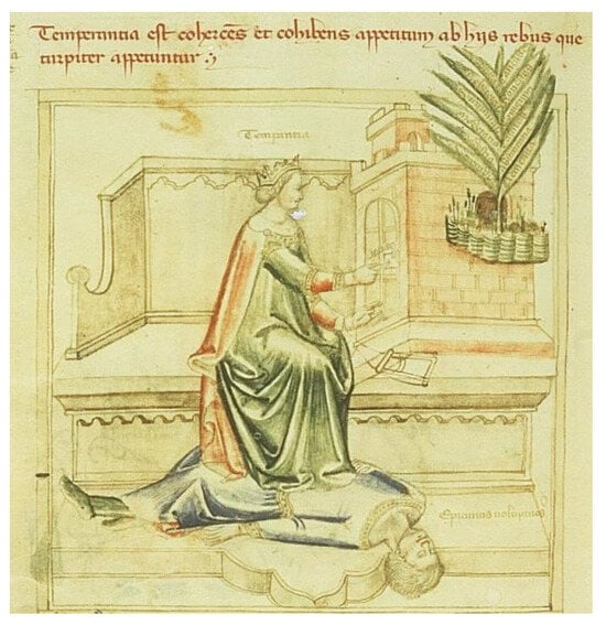Temperance, La Canzone delle Virtu e delle Scienze, Bartolomeo di Bartoli, ca. 1349, Chantilly, Musée Condé, ms. 599, fol. 3.